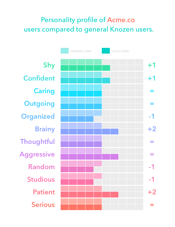 In your report, you’ll see how your users compared to the average Knozen user on twelve personality characteristics:
