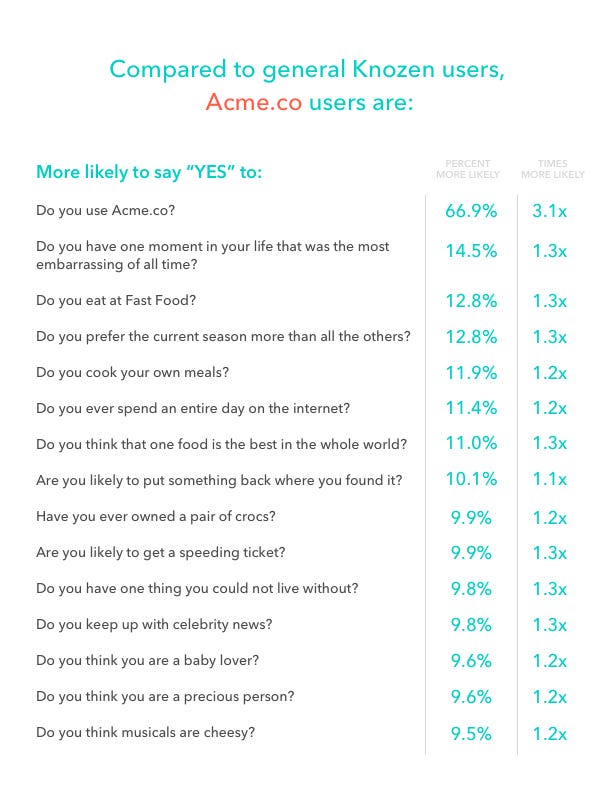 And we’ll provide you with insights about what makes your users unique, and how their answers varied the most from the general population. These insights can generate powerful marketing, product, and sales insights for your team: